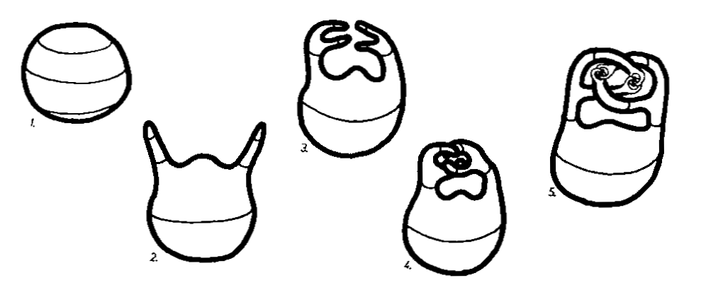„Każdą z [dwóch] rączek rozszczepiamy na dwie (…) i powstałe odgałęzienia przeplatamy ze sobą. (…) Tę konstrukcję kontynuujemy indukcyjnie. Mając w n‑tym kroku 2n rączek (…) konstruujemy 2n+1 obejmujących się rozgałęzień.”