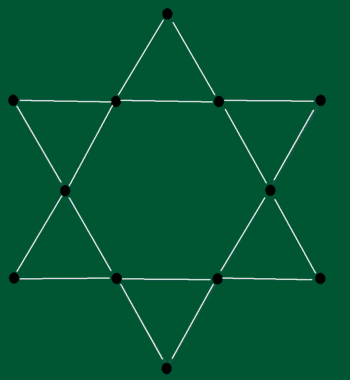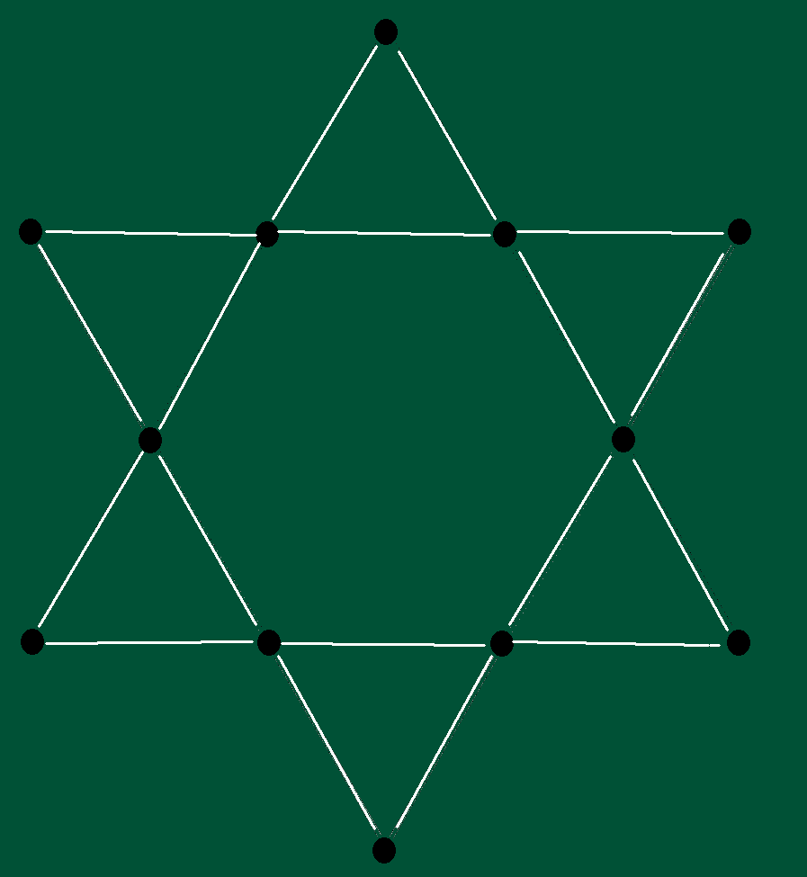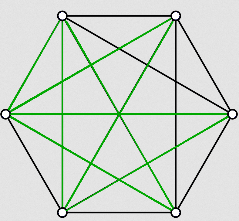 Trójkąt o trzech zielonych krawędziach oznacza trójkę osób, które znają się wzajemnie (każda z każdą).