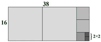 Jak długość boku takiego kwadratu znaleźć? Od prostokąta „odcinamy” z jednego końca kwadrat. Powtarzamy tę czynność kolejno dla prostokątów: 16 ×22, 6 × 16, 6 × 10, 4 × 6 oraz 2 × 4.