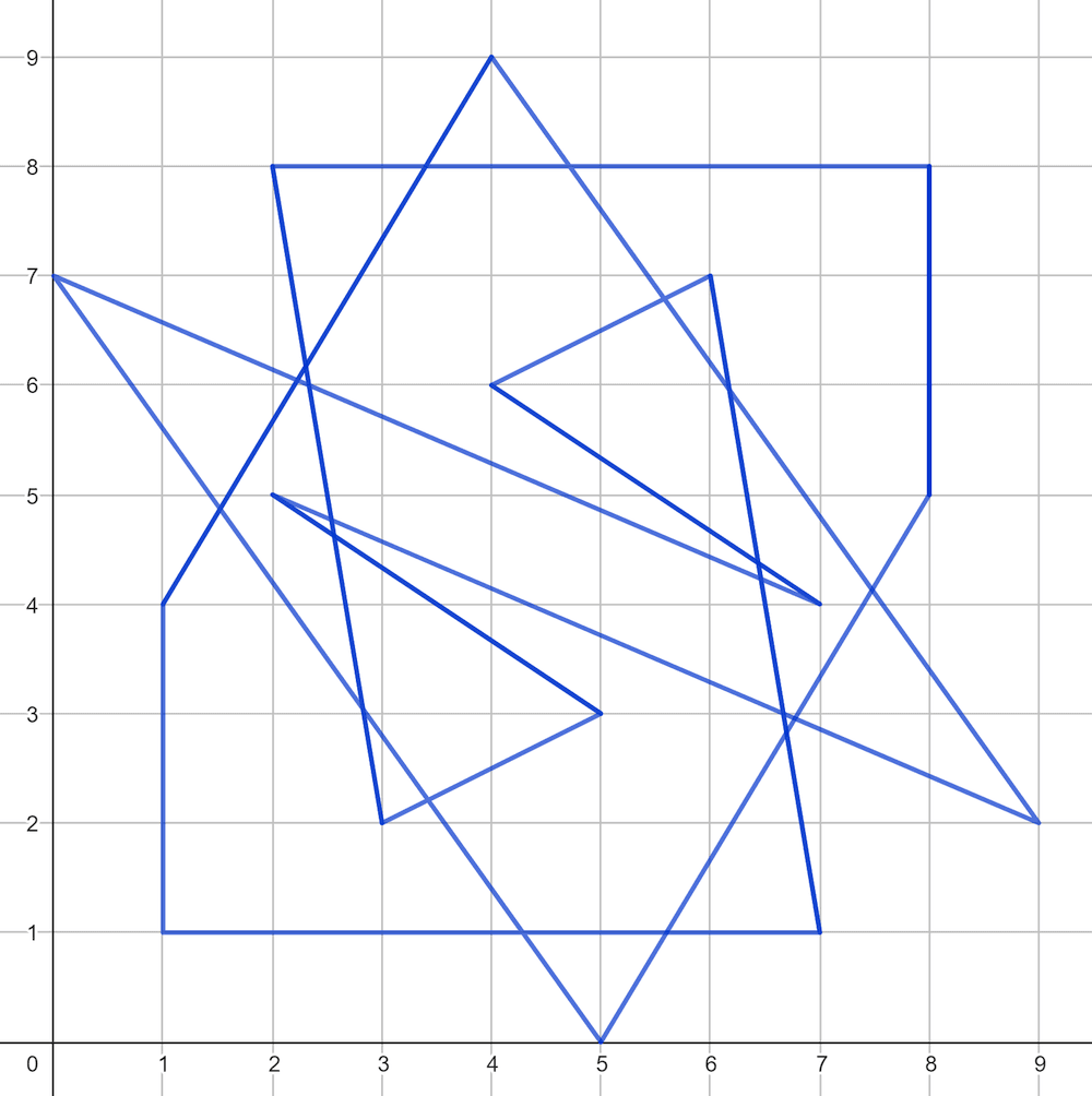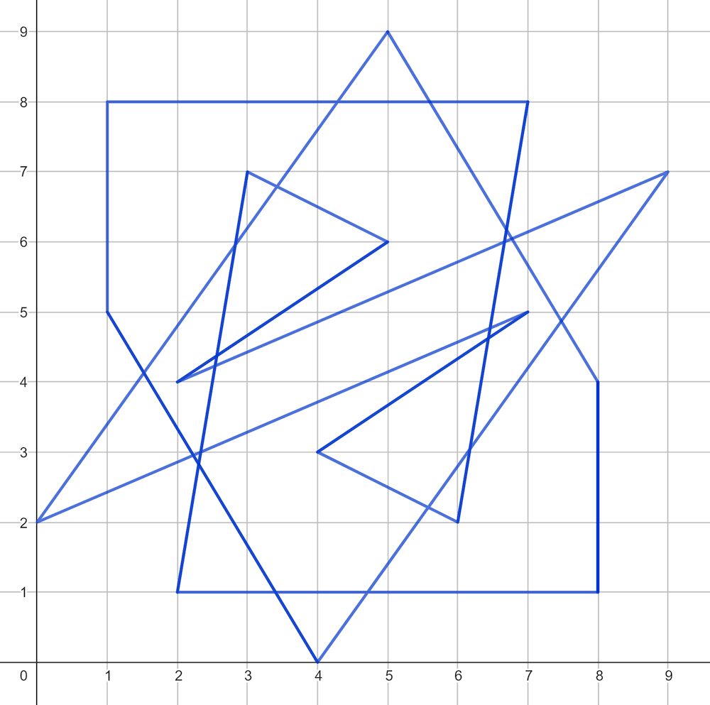 W pierwszym odcinku pokazałem kilka wyszytych figur. Jedna z nich, łamana zamknięta o wierzchołkach (1, 4), (4, 2), (2, 8), (8, 5), (5, 7), (7, 1), to specyficzne wyobrażenie okresu (142857) rozwinięcia dziesiętnego ułamka 1/7.