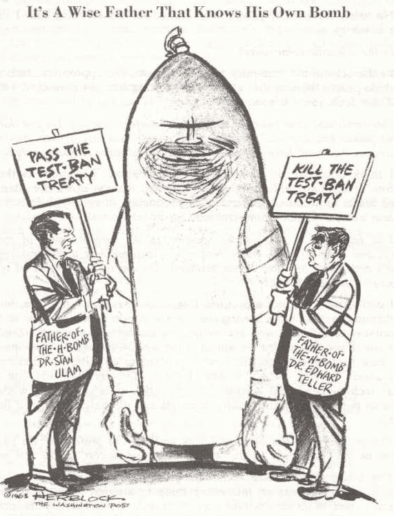 Karykaturzysta Herbert Block, znany z ostrych politycznych rysunków, uchwycił antagonistyczne postawy obu naukowców w swojej ilustracji dotyczącej traktatu o zakazie użycia broni jądrowej, który ostatecznie został ratyfikowany przez Senat w 1964 roku stosunkiem głosów 85:10.